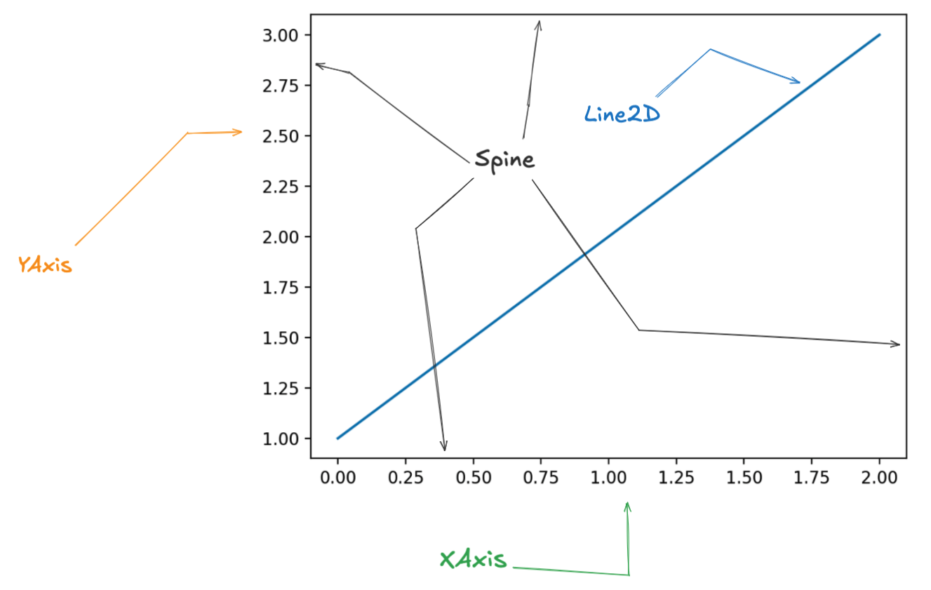 The Figure is the top-level object — it contains everything else. Inside it, you’ll find one or more Axesobjects. Each Axes holds elements like lines, ticks, spines, and text — all of which are objects too!