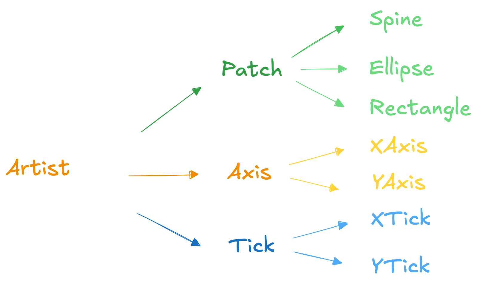 Other classes like Patch or Axis inherit from theArtist class, and additional classes such as Spineor XAxis inherit from them in turn.